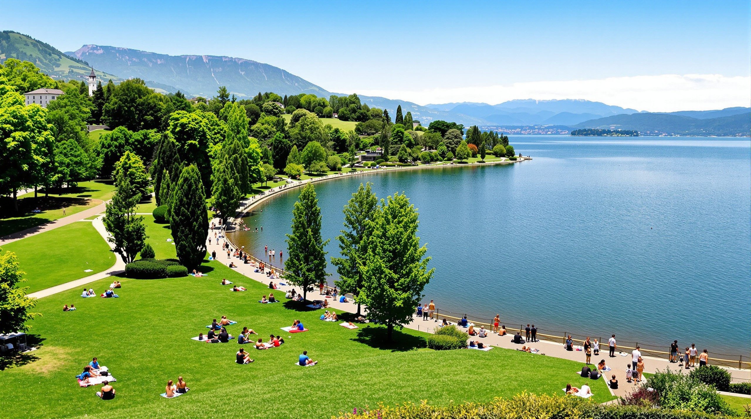 Wide-angle view of Lake Geneva with lush parks, people picnicking on green lawns, families strolling along the lakeside, and friends hiking scenic trails under a clear blue sky, showcasing leisure and tranquility, ideal for those seeking free outdoor events in Geneva